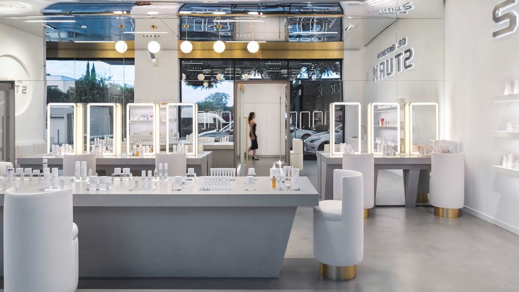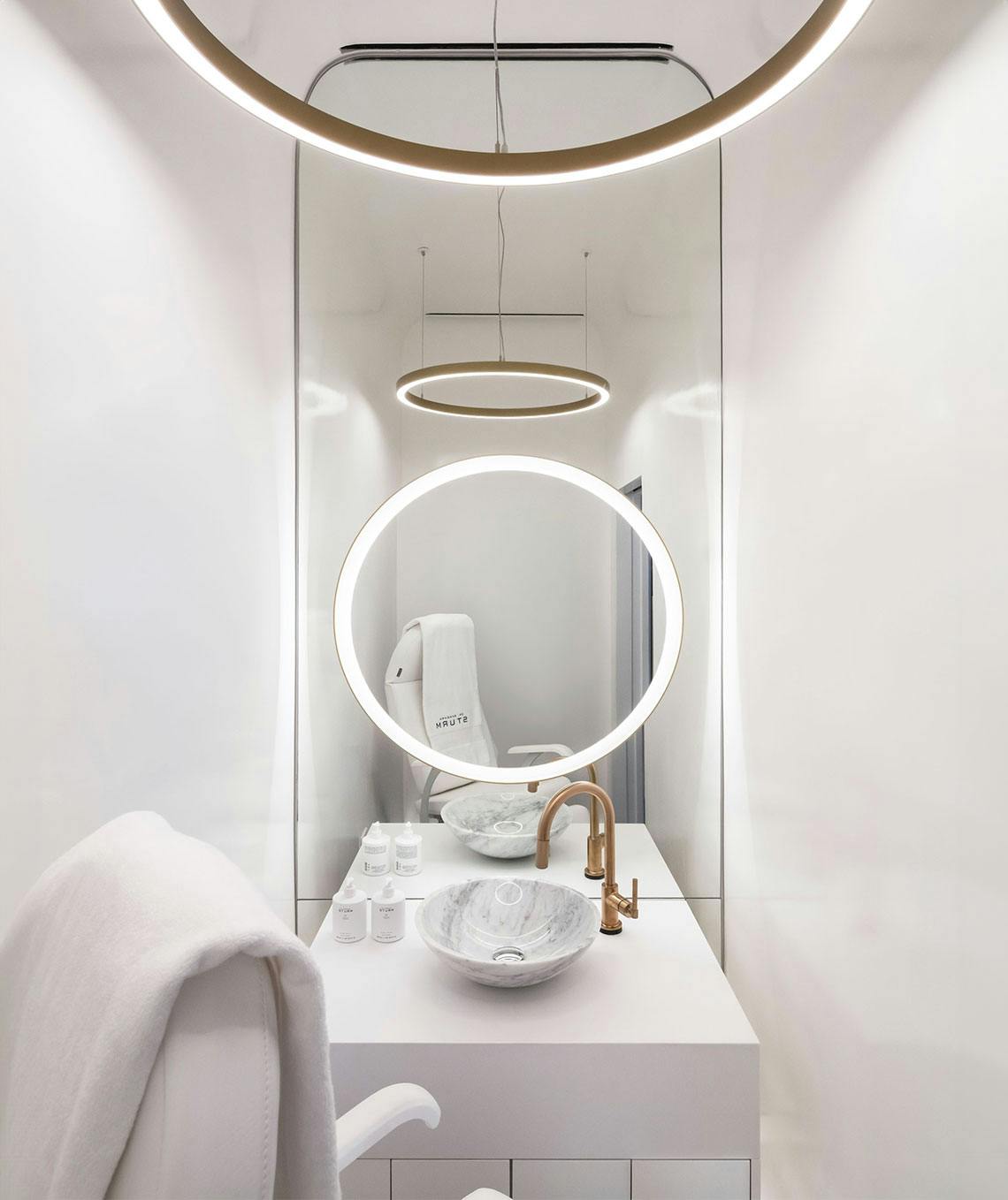 Every detail in this location was custom made specifically for this location; dibond radius ceilings, veneer plaster make – up and center table stations, the custom millwork and furniture. Much effort went in to getting these details correct and executed for this clients second US location.