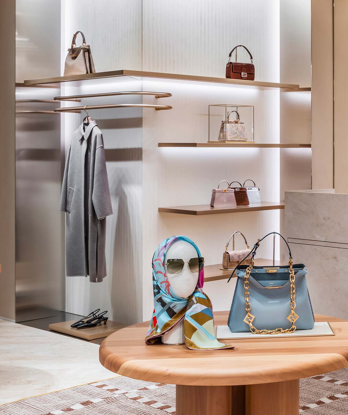 One of two locations we built for Fendi in Saks Fifth Avenue Bevely Hills. Much like the Nieman Marcus space we created, this is beautifully crafted contemporary space. Clean lines and beautiful finish aid in accentuating the clothing and accessories.