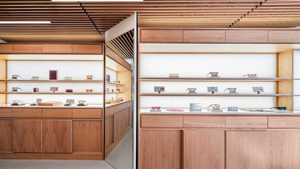 Beautiful wood finishing is the highlight of this space. Custom millwork and milled ceilings punctuate the white walls. The glasses are backlight on the display cases and mirrors built in for viewing.