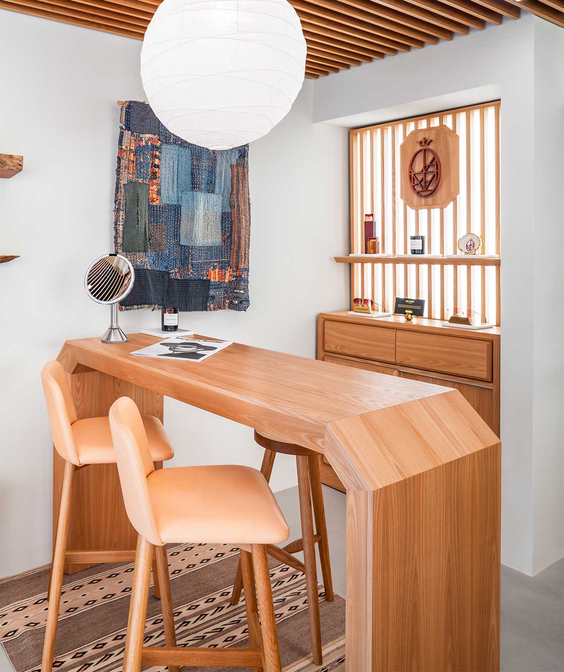 Beautiful wood finishing is the highlight of this space. Custom millwork and milled ceilings punctuate the white walls. The glasses are backlight on the display cases and mirrors built in for viewing.