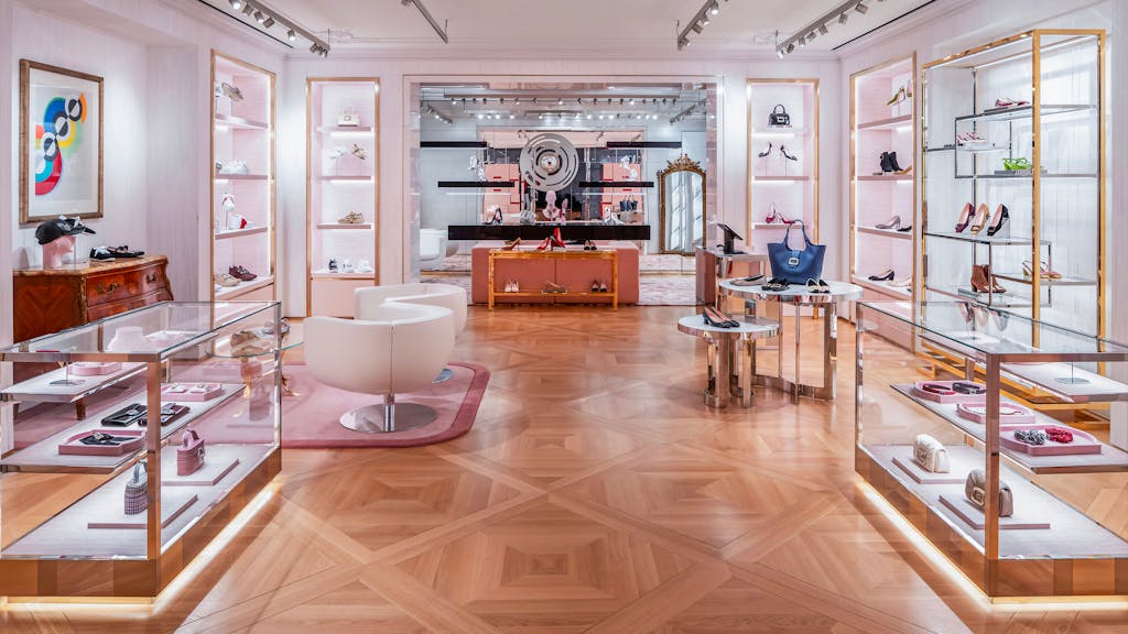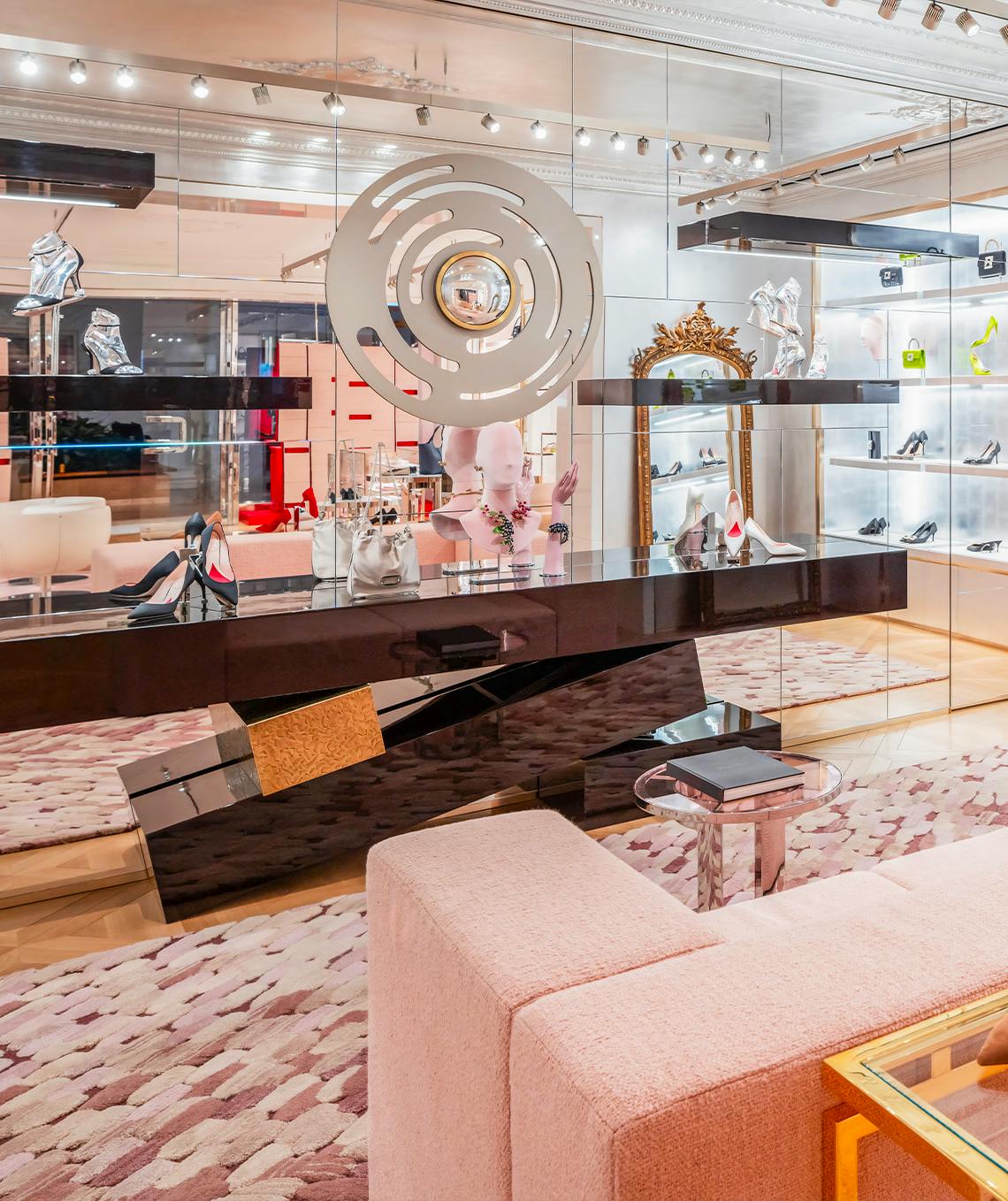 This is a traditional luxury women’s shoe store. Clean display and millwork features. Beautiful custom furniture punctuating the wood floors. Just enough lighting to keep a warm feel and tone. We did a complete interior build and new stone façade.