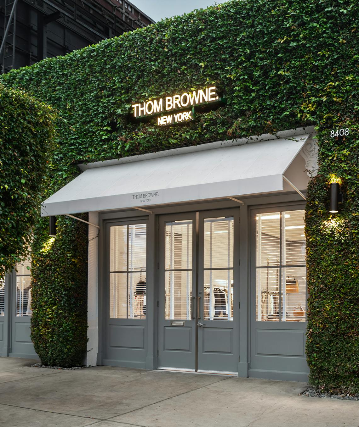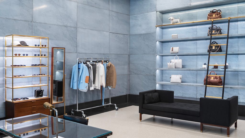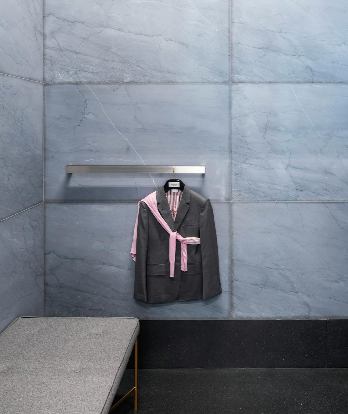 Stone clad interior walls make this building feel like a Milanese 1930s institutional building. The coffered ceilings with stark lighting an bright white paint juxtapose the highly finished terrazzo floors. The clothing hung on minimal fixtures.