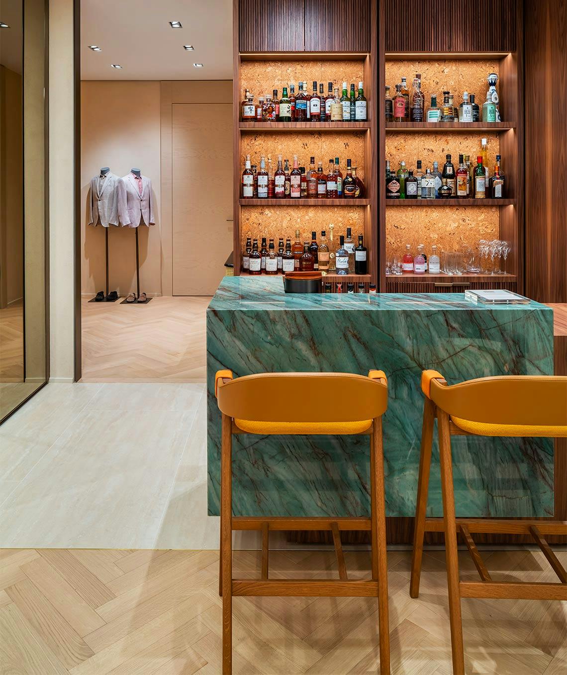 A full interior / exterior construction was required for the Zegna flagship located on Rodeo Drive. This highly tailored space was crafted with great precision and detailing. Many of the elements are costume made by Ferrante Koberling such as the main stairs cladded in stainless steel ascending to the second floor.