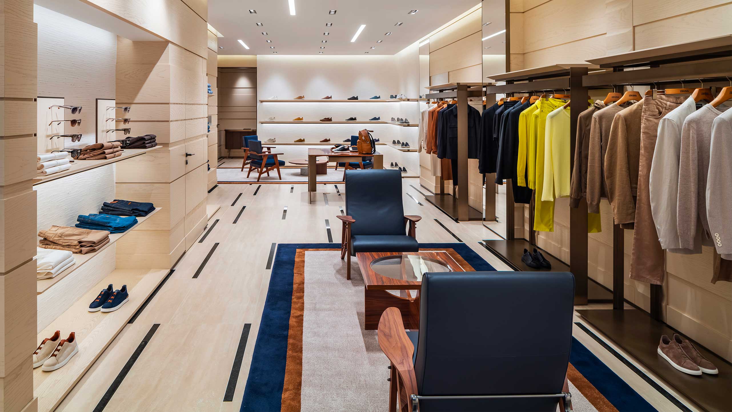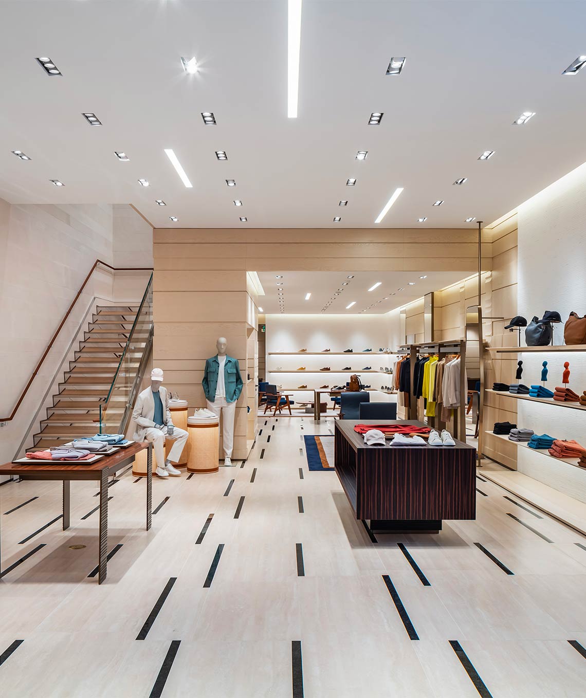 A full interior / exterior construction was required for the Zegna flagship located on Rodeo Drive. This highly tailored space was crafted with great precision and detailing. Many of the elements are costume made by Ferrante Koberling such as the main stairs cladded in stainless steel ascending to the second floor.